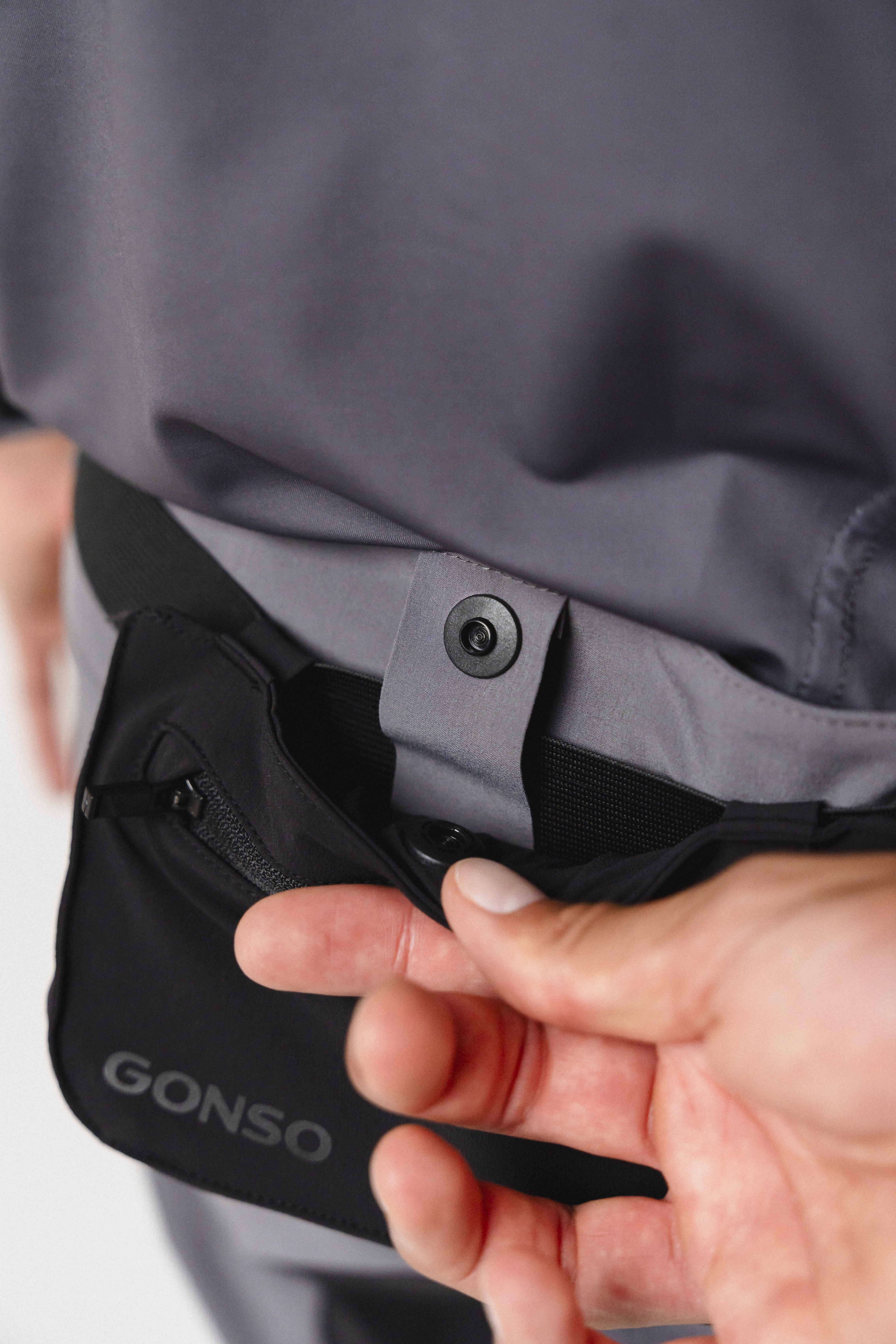 - Weitenregulierbarer Bund mit abnehmbarer Belt-Pocket